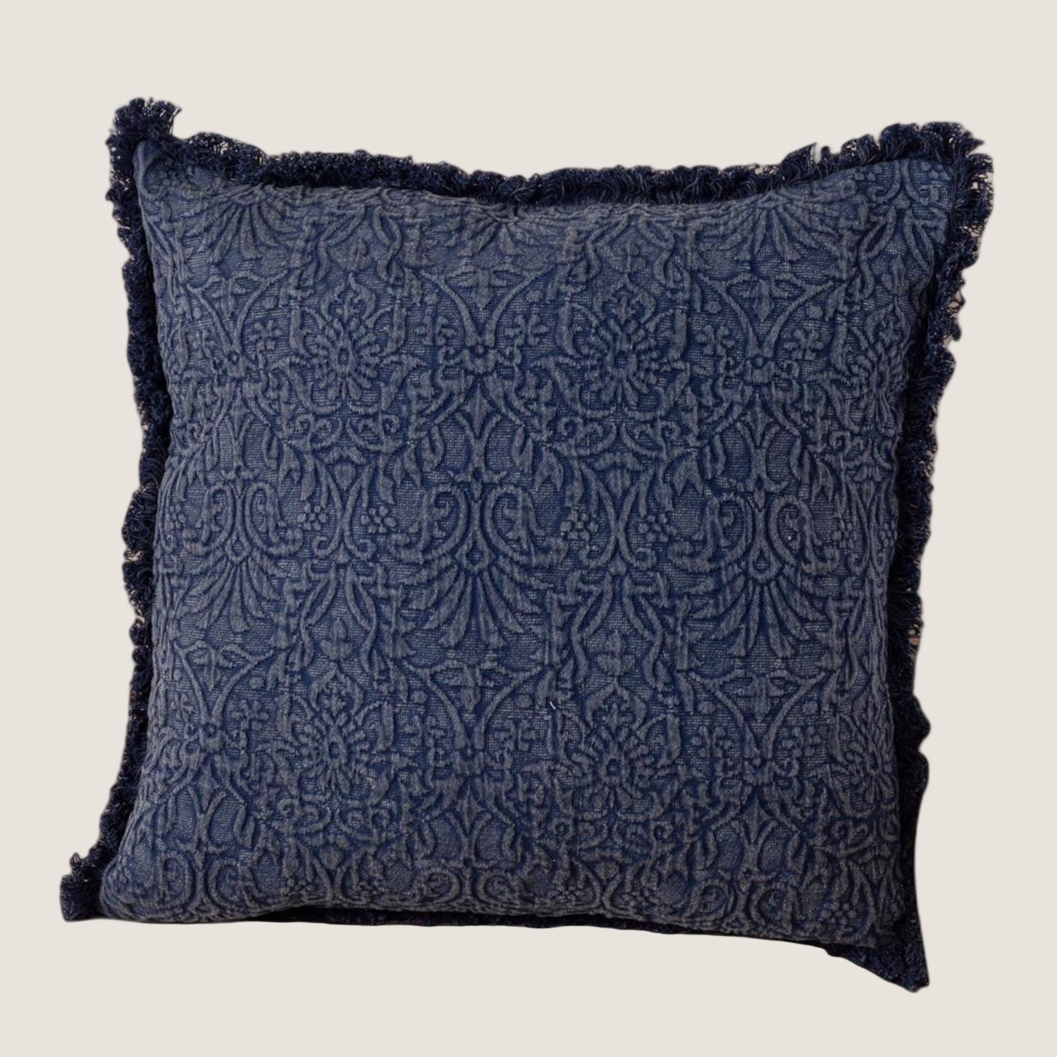 This 20-inch square pillow showcases a woven matelassé medallion pattern in a deep indigo hue, adding both texture and elegance to your decor. The soft cotton-poly blend offers comfort, while the fringed edges bring a relaxed, finished touch. Ideal for layering on a bed, sofa, or bench, this pillow makes a bold yet versatile statement.