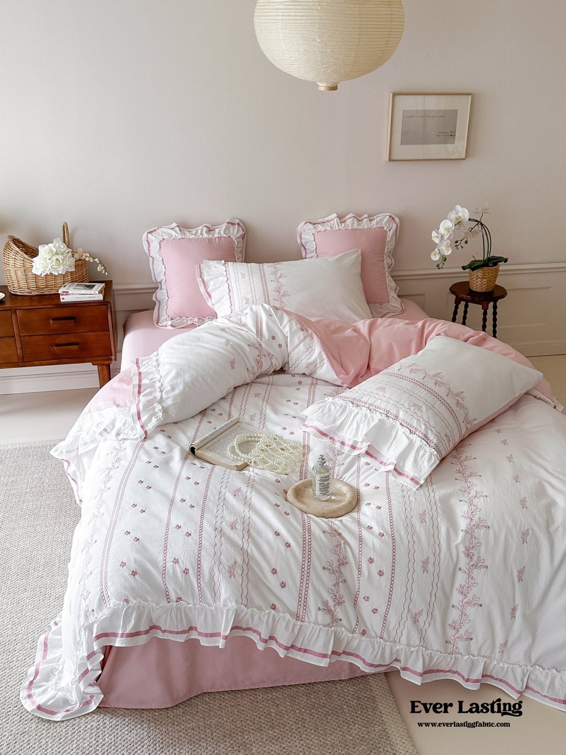 Transform your bedroom into a cozy cottagecore oasis with Ever Lasting's exquisite Embroidered French Lace Ruffle Duvet Cover. Made from breathable 100% washed cotton, it adds elegance, romance, and comfort to your sleep experience. With corner loops and a hidden zipper, it also keeps your duvet insert clean. Elevate your décor with this luxurious duvet cover.