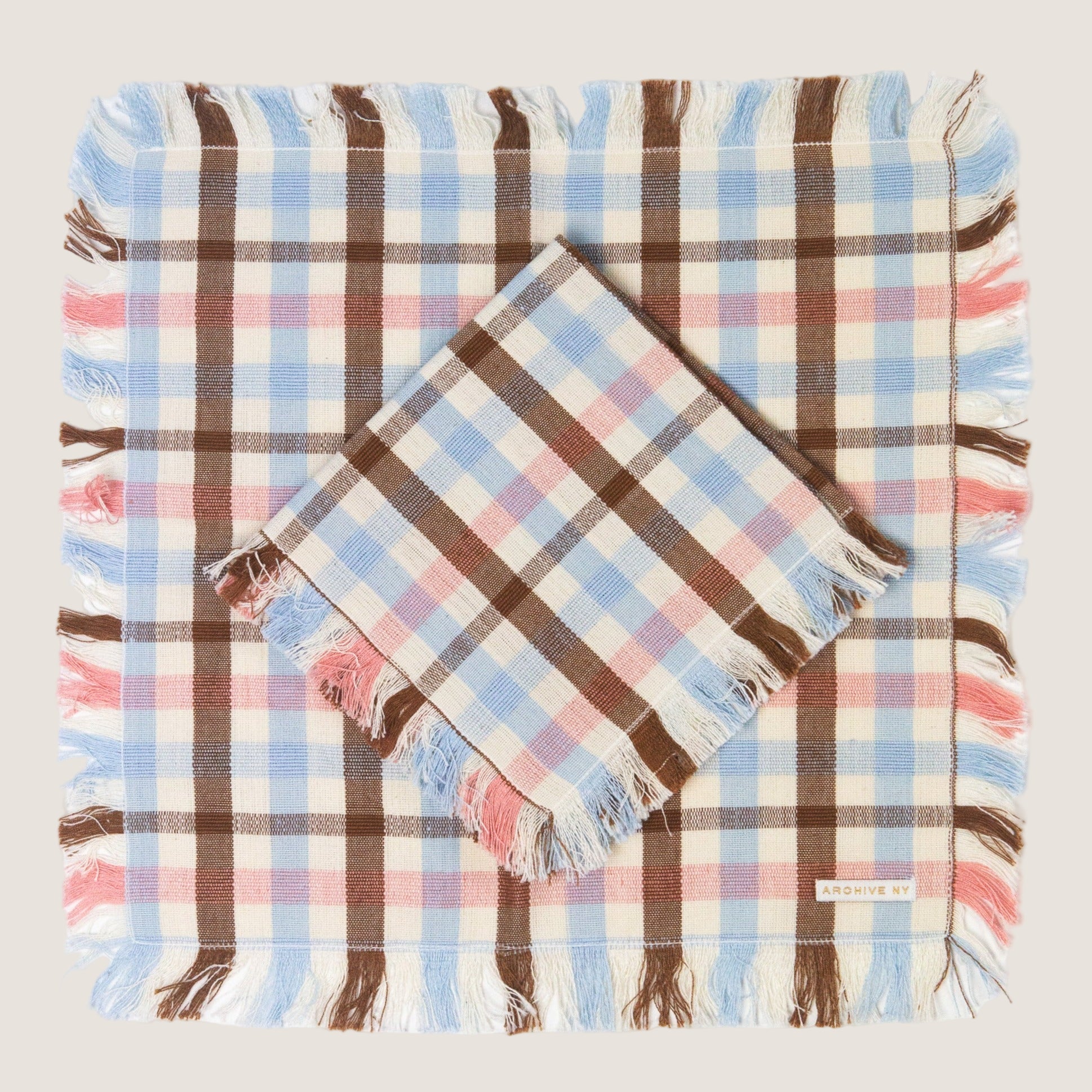 The Louisa plaid party napkin will add soft color and texture to any table setting. The party napkin is smaller in size than our dinner napkin and has a fringe around the edges. Stripes of light pink, baby blue and umber are woven together to create this textile. Ethically handwoven by artisans in Xela, Guatemala.